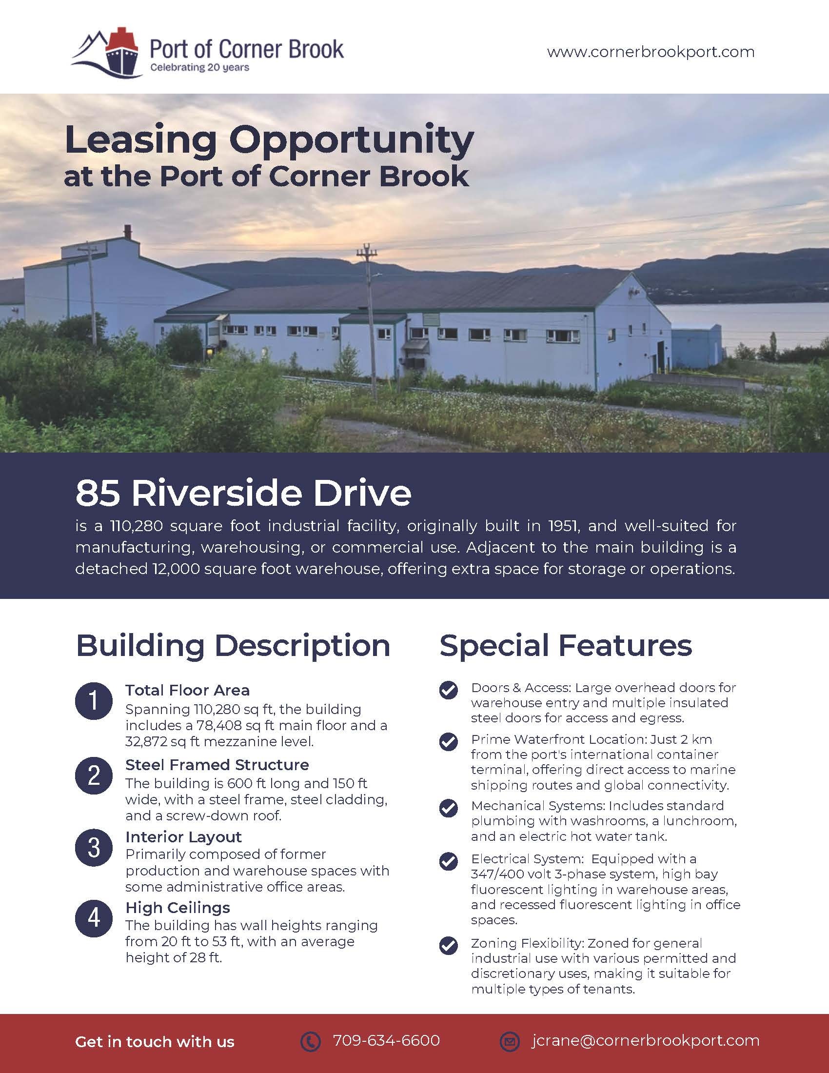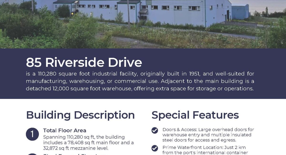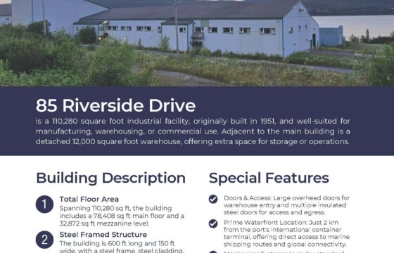 85 Riverside Drive is waterfront property directly connected to port facilities from Port of Corner Brook in Approximately 2km from the port's international container terminal (western terminal)